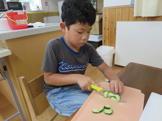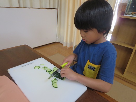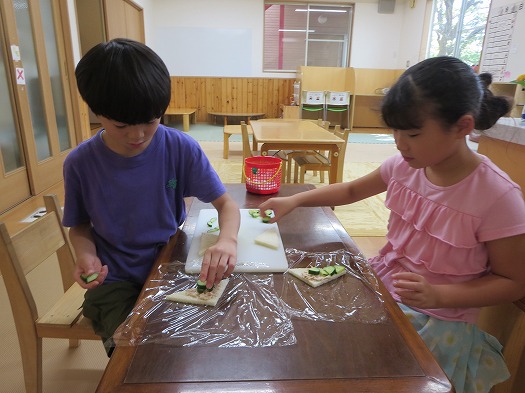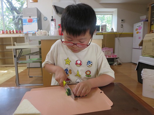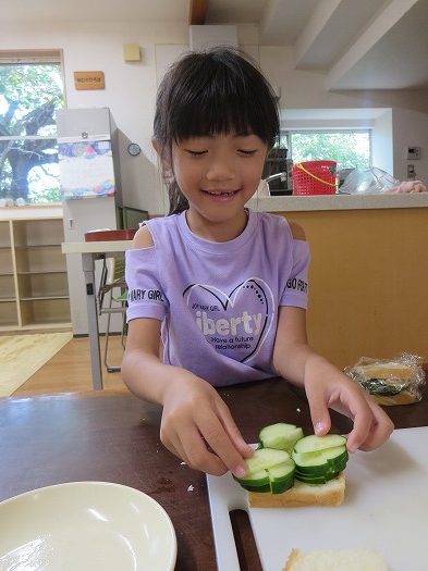 2025年09月11日 クッキング ブログ きゅうりを切ってサンドイッチをつくりました。 猫の手にして切っていて包丁の扱いが上手です。 それぞれ、パンやきゅうりはどんな形に切るか、また,置く場所や挟む順番など友だちと話をしながら工夫していました。 おうちでも一緒にクッキングをしてみてください。 一覧へ戻る